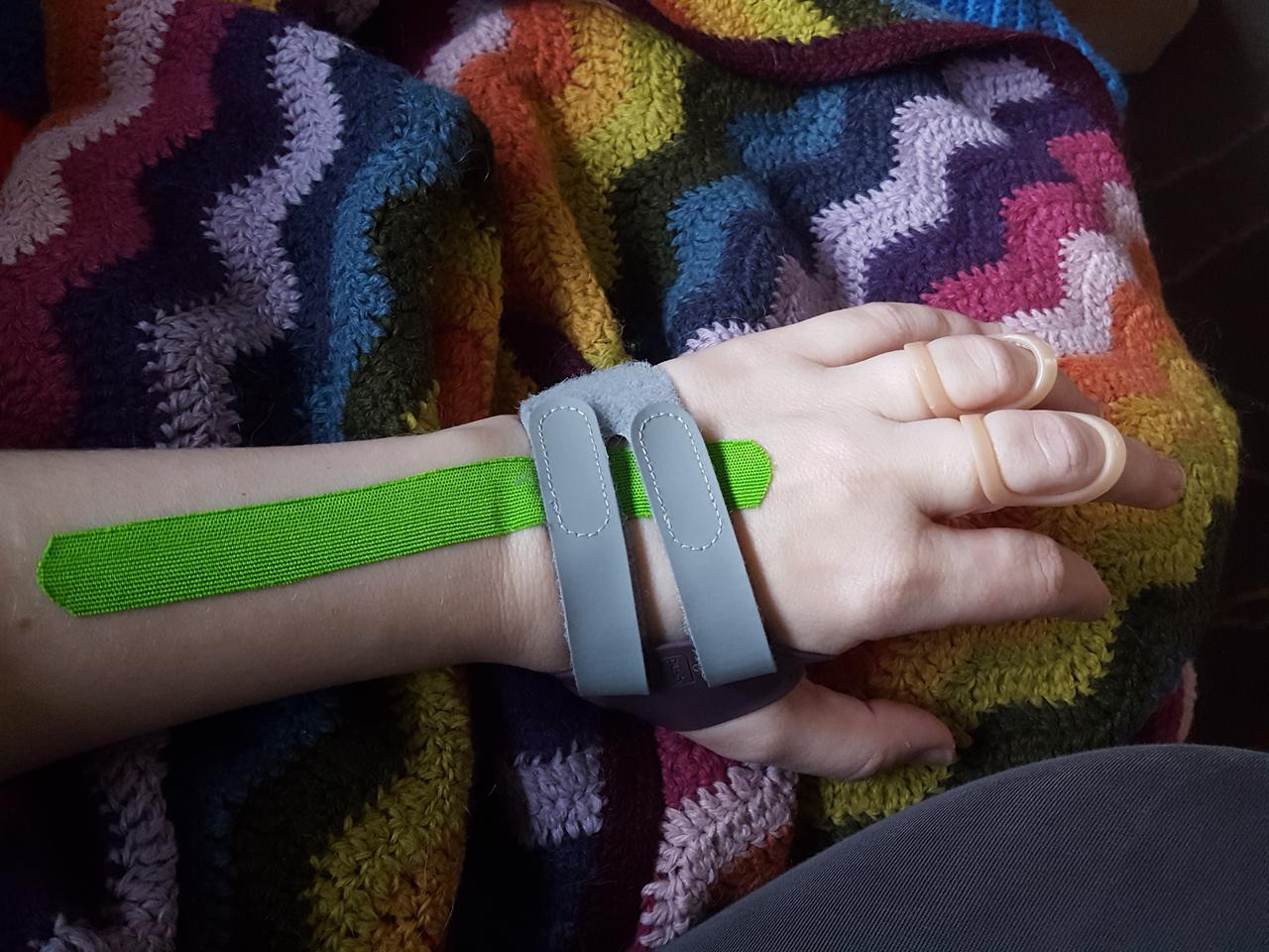 Baldaŭ mi renkontiĝos kun mia terapeŭto kaj mi esperas ke mi ricevos pli bonajn ortezojn por ĉiuj miaj fingroj.